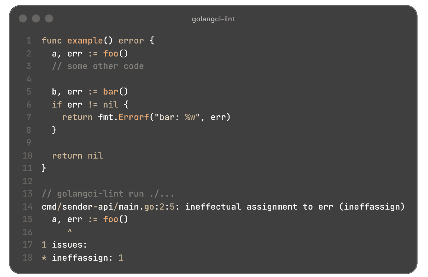 In this example, you might think that other linters would identify that `err` is unused, or that it’d even be a compiler error. But sadly, it doesn’t count as unused, because the variable as a whole is used, even if the value assigned on line 2 isn’t used; `ineffassign` will identify that the assignment on line 2 has no effect, and thus identify the bug.
