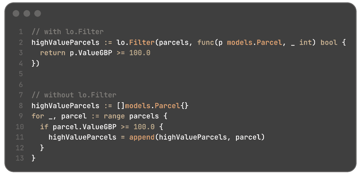 Go is a very simple language that offers excellent benefits, including a shallow learning curve. But sometimes simple things can require more boilerplate code than ideal. One of our favourite libraries is samber/lo, which is a lodash style library for Go, which those from a JavaScript background will likely be familiar with. This differs from idiomatic Go, but can result in much easier-to-read and maintain code.